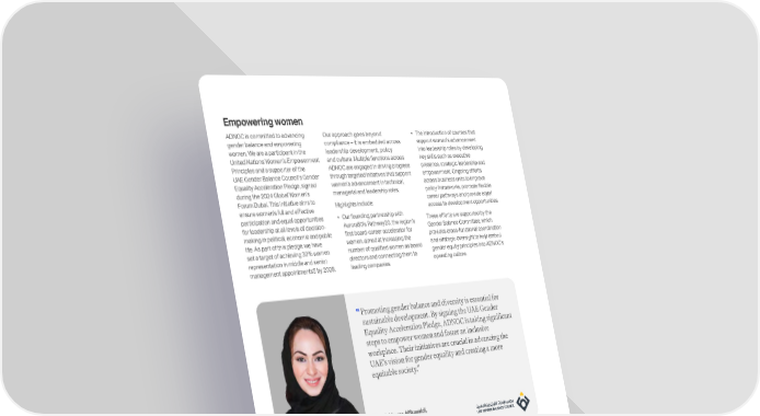 Empowering women ADNOC is committed to advancing gender balance and empowering women. We are a participant in the United Nations Womens Empowerment Principles and a supporter of the UAE Gender Balance Councils Gender Equality Acceleration Pledge, signed during the 2024 Global Womens Forum Dubai. This initiative aims to ensure women's full and effective participation and equal opportunities for leadership at all levels of decision- making in political, economic and public life. As part of this pledge, we have set a target of achieving 30% women representation in middle and senior management appointments5 by 2028. Our approach goes beyond compliance it is embedded across leadership development, policy and culture. Multiple functions across ADNOC are engaged in driving progress through targeted initiatives that support womens advancement in technical, managerial and leadership roles. Highlights include: Our founding partnership with Aurora50s Pathway20, the regions first board-career accelerator for women, aimed at increasing the number of qualified women as board directors and connecting them to leading companies Investing in and engaging with our communities We believe that our success and resilience as a company is connected to the success and resilience of the communities we serve. Beyond economic contribution, our social impact is measured by how we manage community concerns and develop the communities in which we operate. With significant local presence and wide-ranging operations, our social license to operate is rooted in trust and social development. We work with government entities and other external stakeholders to help us have a positive impact on community development. We are committed to creating positive impact through community initiatives and social volunteering. Guided by our Corporate Social Responsibility (CSR) Strategy, we invest in programs to enhance education, promote health and wellbeing, conserve the environment and empower diverse communities in line with the national development goals. While many of our programs and initiatives have been in place for several years, each year we assess how we can further improve and develop our CSR approach. We actively work to embed social considerations into our operations to help us identify potential impacts and community concerns early and manage them responsibly. This includes maintaining open and transparent communication channels with communities and aligning with a globally recognized standard to safeguard against social risks. Promoting gender balance and diversity is essential for sustainable development. By signing the UAE Gender Equality Acceleration Pledge, ADNOC is taking significant steps to empower women and foster an inclusive workplace. Their initiatives are crucial in advancing the UAE's vision for gender equality and creating a more equitable society. H.E. Mouza AlSuwaidi, Secretary General, UAE Gender Balance Council The introduction of courses that support womens advancement into leadership roles by developing key skills such as executive presence, strategic leadership and empowerment. Ongoing efforts across business units to improve policy frameworks, promote flexible career pathways and provide equal access to development opportunities These efforts are supported by the Gender Balance Committee, which provides cross-functional coordination and strategic oversight to help embed gender equity principles into ADNOCs operating culture. 112