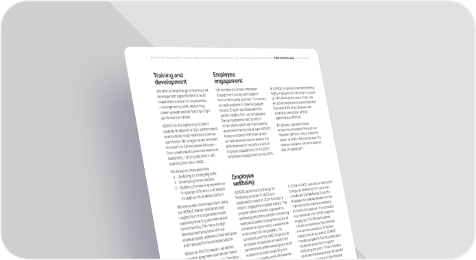 Employee engagement Training and development Employee wellbeing We conduct an annual employee engagement survey with support from a third-party provider. The survey is made available in three languages (Arabic, English and Malayalam) to gather insights from our employees. Survey outcomes help to inform action plans which are monitored by appointed champions at each ADNOC Group company. We follow up with annual pulse surveys to assess the effectiveness of our actions and to improve engagement. In the 2024 employee engagement survey, 82% We offer a broad range of training and development opportunities to build capabilities across the organization strengthening skills, supporting career growth and reinforcing a high- performance culture. ADNOC is strengthening its talent pipeline to support a high-performance, accountable, multi-skilled and diverse workforce. Our programs are intended to cover the full employee lifecycle from youth development to executive leadership driving alignment with evolving business needs. We focus on three priorities: 1. Upskilling on emerging skills 2. Developing future leaders 3. Digitizing the learning experience for greater efficiency and impact through an AI-enabled platform We take a data-driven approach, using our ADNOC master skill library and insights from the organization-wide capability drive to guide internal skill benchmarking. This helps to align development programs with our strategic goals, address critical skill gaps and meet performance expectations. Based on this framework, we deliver targeted programs such as the Talent Accelerator and Leadership Transition, along with specialized training in AI, environmental stewardship, data analysis and cybersecurity. In 2024, employees completed approximately 1.5 million hours of training approximately a 17% increase from 2023 reflecting our ongoing commitment to workforce development as a foundation for sustainable performance. We also support employees in planning for life beyond their careers. Our pre-retirement program, which had approximately 200 participants in 2024, offers guidance on goal setting and transition planning, while initiatives like Khebra and ADNOC Pioneers leverage the expertise of retired professionals through mentoring and consultancy opportunities. We hosted an annual ADNOC Pioneers Forum which saw more than 1,000 attendees in 2024. ADNOC launched the Energy for Wellbeing program in 2023 and expanded its reach in 2024 to foster a vibrant, engaged workplace culture. The program takes a holistic approach to wellbeing, prioritizing people, enhancing workplace quality, strengthening social cohesion and promoting a sustainable environment for employees, the community and the UAE. Its goal is to empower employees to realize their personal and professional goals, build resilience, boost productivity and maintain a healthy work-life balance. As part of this initiative, ADNOC launched the Employee Assistance Program, offering employees and their families access to psychologists, dieticians, fitness and life coaches, as well as financial and legal consultants. In addition, all ADNOC Group employees and their families benefit from health and wellbeing apps such as TruDoc and Daman, which provide 24/7 access to multilingual doctors, teleconsultation services, prescription management and specialist referrals. TruDoc also enables appointment bookings and offers customized wellness programs, including meal and exercise plans. In 2024, ADNOC launched a dedicated Energy for Wellbeing microsite and introduced the Wellbeing Toolkit for Managers to educate leaders on the importance of employee wellbeing and work-life balance. The company also rolled out over 2,000 programs engaging 175,000 participants, including employees, their families and service providers. To further support working parents, ADNOC introduced parent-friendly workplace initiatives under the Energy for Wellbeing program. These include a dedicated helpdesk email, AI chat for instant assistance and Viva Engage communities such as the parent- friendly community, designed to foster engagement and promote a balanced work culture. We continue to collaborate through strategic partnerships with various UAE government entities, including the Department of Community Development and its subsidiaries, to further enhance the wellbeing of ADNOC employees and the wider UAE community. 33 For more details on our Takallam platform, refer to How we Operate of ADNOC employees reported feeling highly engaged, contributing to a score of 74%, the highest since 2016. The employee experience score indicated that over 84% of employees had a positive perception of their experience at ADNOC. Employees can also provide anonymous feedback through our Takallam platform, which means to speak in Arabic. Employees use it to raise and address concerns without fear of retaliation 33 . 109 ADNOC Sustainability Report 2024 EMPOWERING LIVES KEEPING OUR PEOPLE SAFE ADVANCING NET ZERO HOW WE OPERATE SUSTAINABILITY AT ADNOC ABOUT ADNOC PROTECTING NATURE AND BIODIVERSITY