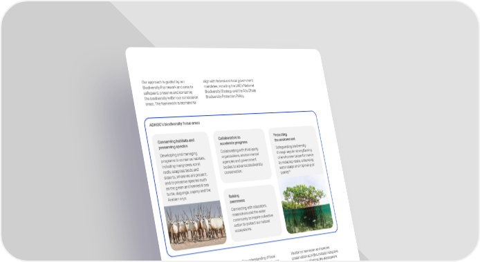 Our approach is guided by our Biodiversity Framework and aims to safeguard, preserve and conserve the biodiversity within our concession areas. The framework is intended to We consider international frameworks and best practices, including the International Finance Corporation's (IFC) Performance Standard 6 (PS6), Equator Principles (EP4) and industry best practices such as IPIECA industry guidance. We work closely with the EAD, which regulates and manages protected areas in Abu Dhabi, including those within our concessions in Abu Dhabi. The mitigation hierarchy avoid, minimize, restore and offset is embedded into our Biodiversity Framework and expected to be applied throughout project lifecycles, including project design, construction, operation, decommissioning and reclamation. EIAs are conducted for new projects and significant operational modifications. Biodiversity assessments, a critical element of EIAs, involve comprehensive ecological surveys to establish a align with federal and local government mandates, including the UAEs National Biodiversity Strategy and the Abu Dhabi Biodiversity Protection Policy. Conserving habitats and preserving species Developing and managing programs to conserve habitats, including mangroves, coral reefs, seagrass beds and deserts, where we are present, and to preserve species such as the green and hawksbill sea turtle, dugongs, osprey and the Arabian oryx. ADNOCs biodiversity focus areas Collaboration to accelerate progress Collaborating with third-party organizations, environmental agencies and government bodies to advance biodiversity conservation. Protecting the environment Safeguarding biodiversity through regular strengthening of environmental performance by reducing waste, enhancing water usage and improving air quality. 30 Raising awareness Connecting with educators, researchers and the wider community to inspire collective action to protect our natural ecosystems. baseline understanding of local species and habitats, identify and assess potential impacts and prioritize mitigation measures to help implement biodiversity management best practices. Biodiversity Action Plans (BAPs) are developed for operations within critical and sensitive areas and contain the ecosystem-specific mitigation measures and monitoring that are to be incorporated into a project throughout its lifecycle. All ADNOC activities within defined protected areas require an EAD permit, which mandates comprehensive biodiversity management plans, regular environmental monitoring and the submission of compliance reports and any additional requirements as determined by the inhabited species. Habitat conservation and species preservation activities include mangrove and seagrass planting, the deployment of artificial coral reef habitats and the monitoring and management of species such as the hawksbill turtle, the osprey, houbara, dugong and the Arabian oryx across our concessions. We track biodiversity changes through monitoring programs and assess the effectiveness of mitigation measures. Monitoring programs are tailored based on the criticality and sensitivity of species and habitats and may include species tracking programs, periodic biodiversity assessments and regular site visits to evaluate biodiversity management efforts. 30 For more information, refer to the Environmental management section in this chapter. 92