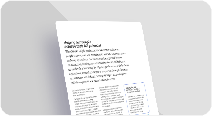 Helping our people achieve their full potential We cultivate a high-performance culture that enables our people to grow, lead and contribute to ADNOCs strategic goals and daily operations. Our human capital approach focuses on attracting, developing and retaining diverse, skilled talent across levels of seniority. By aligning performance with business aspirations, we seek to empower employees through clear role expectations and defined career pathways supporting both individual growth and organizational success. We invest in creating a highly skilled, diverse and capable workforce to drive performance. Our Group Human Capital Directorate sets ADNOCs people strategy, policies and guidelines in line with our corporate strategy and operational needs. It is responsible for overseeing the attraction, recruitment, mobility, development, succession and retention of talent, as well as the professional growth and development of employees. We have a company-wide performance management system in place. Employee key performance indicators are individual and meant to align with our business objectives so employees understand how they can contribute. We promote a culture that enables and energizes our employees. We have adopted a holistic approach to attract, develop and engage our people. The system is supported by an annual rewards program that incentivizes excellence and contributes to a performance-driven culture. We make ADNOC employees aware of potential career paths through centralized role profiles detailing technical and leadership progression pathways. This enables managers across levels to engage with employees on what key competencies are required for them to develop and advance within the company. In 2023, we started a program to develop our high performance and accountable culture. In 2024, we expanded this effort through the ADNOC Culture Masterclass, delivered by over 60 trained culture facilitators. The masterclass reached more than 3,500 managers representing 82% of middle management and received a 94% satisfaction rating. It was supported by the Culture Dashboard, featuring over 30 organizational metrics to assess cultural and performance outcomes. Throughout 2025, ADNOC intends to increase the coverage of middle management trained on ADNOC Culture Masterclass and extend the initiative to high-potential youth across ADNOC. Equipping our people to lead the AI transformation At ADNOC, we are equipping our people to lead the transformation as we advance our ambition to become the world's most AI-enabled energy company. In 2024, more than 40,000 employees completed foundational AI training. 108