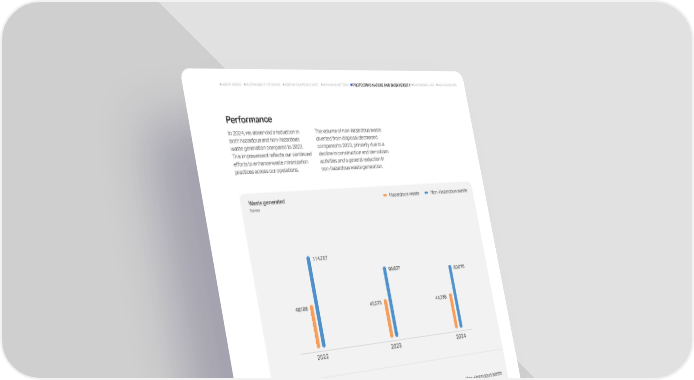 Performance In 2024, we observed a reduction in both hazardous and non-hazardous waste generation compared to 2023. This improvement reflects our continued efforts to enhance waste minimization practices across our operations. The volume of non-hazardous waste diverted from disposal decreased compared to 2023, primarily due to a decline in construction and demolition activities and a general reduction in non-hazardous waste generation. Waste generated Hazardous waste Non-Hazardous waste Waste diverted from disposal Tonnes Tonnes Hazardous waste Non-Hazardous waste 89 ADNOC Sustainability Report 2024 ADVANCING NET ZERO KEEPING OUR PEOPLE SAFE EMPOWERING LIVES HOW WE OPERATE SUSTAINABILITY AT ADNOC ABOUT ADNOC PROTECTING NATURE AND BIODIVERSITY