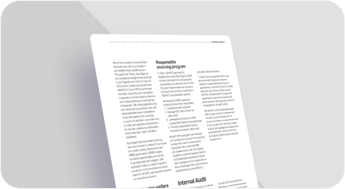 Responsible sourcing program Internal Audit Contractor welfare We strive to adhere to responsible business partnering principles in our relationships, guided by our Procurement Policy, due diligence and evaluation programs as outlined in our Supplier and Partner Code of Ethics and contractual agreements. ADNOCs Code of Ethics enforces fair labor practices, anti-corruption measures, environmental protection and responsible use of confidential information. Our active suppliers and partners have signed this code, with dedicated ethics and compliance channels available for reporting concerns. In addition, we screen and monitor our suppliers and partners to monitor compliance with safety, environmental, health and labor standards. By integrating responsible sourcing with our In-Country Value (ICV) program and health, safety and environment (HSE) governance, ADNOC seeks to embed sustainability and ethics in our procurement program. This approach helps us create long-term economic, environmental and social value for ADNOC, our suppliers and the communities we serve. In 2024, ADNOC launched its Responsible Sourcing Program (RSP) to boost transparency and promote sustainable procurement. Further, the Program helps ensure our procured products and services contribute to ADNOCs sustainability agenda. Achieving the RSPs goals are centered around four main pillars: 1. Collaborate with suppliers 2. Manage ESG risks across the value chain 3. Leverage technology to better manage ESG risks and opportunities 4. Promote sustainability leading practices across the value chain As part of the program, we reviewed and updated our procurement policies to align with current sustainability standards. We conducted ESG pre-assessments with 30 strategic suppliers, organized supplier forums and stakeholder sessions to foster open dialogue and to collaborate on future strategies that could enhance sustainability across ADNOCs The Internal Audit function, an internal part of ADNOC, operates under the oversight of the ADNOC Audit Committee, a subcommittee of the Board. Our Internal Audit follows a centralized assurance approach, including all operated companies in a comprehensive annual risk-based audit planning process. Strategic alignment of the audit function is maintained through five-year plans refreshed annually, along with a rolling three-year risk-based internal audit plan reviewed yearly. These plans are also revisited in response to significant changes in the business landscape or risk profile. Our internal audit priorities are determined through the outcomes of a structured risk assessment process, aligned with Abu Dhabi Accountability Authority (ADAA) regulations and the Institute of Internal Auditors (IIA) Global Internal Audit Standards (GIAS) and informed by stakeholder input, ADNOCs approach to responsible sourcing is closely tied to our commitment to the health, safety and wellbeing of contractors across our operations. This commitment is embedded within the ADNOC HSE Control Framework and governed by the Contractor HSE Management Manual, which defines the minimum welfare requirements that contractors must meet, regardless of their site location or conditions. The objective is to improve contractor welfare conditions in their site locations, including accommodation, recreation, catering, medical and other facilities. It also focuses on remuneration, wages, employee leave and end-of-service requirements that may affect contractor employee wellbeing. procurement and projects. To build internal capability, 90% of our procurement employees received training in responsible sourcing and governance, empowering them to make procurement decisions that support ADNOCs Sustainability Strategy. We developed a customized sustainable procurement training program which is scheduled for roll out in 2025. We seek to continue enhancing the RSP by improving the measurement, monitoring and management of environmental and social performance in our supply chain. Key focus areas include tailored supplier engagement, enhanced ESG metric monitoring and robust performance evaluation mechanisms. including ESG considerations. We follow an extended assurance internal audit model, which covers governance, operations, IT, finance, standards/regulations, and monitoring and reporting and includes a thorough one-year audit scope for each area. Our audit model has been recognized with the IIA Regional Leading Practice Award 2024 in the IAESG category for its innovative and impact-driven audit practices. ESG aspects are integrated within this extended assurance model as appropriate, supported by relevant ISO and other local and international standards, along with dedicated audits to strengthen ESG assurance and drive continuous improvement. Audit findings, including ESG-related issues, are tagged in the Audit Management System for efficient tracking and repoting. 143 ADNOC Sustainability Report 2024 HOW WE OPERATE KEEPING OUR PEOPLE SAFE ADVANCING NET ZERO EMPOWERING LIVES SUSTAINABILITY AT ADNOC ABOUT ADNOC PROTECTING NATURE AND BIODIVERSITY
