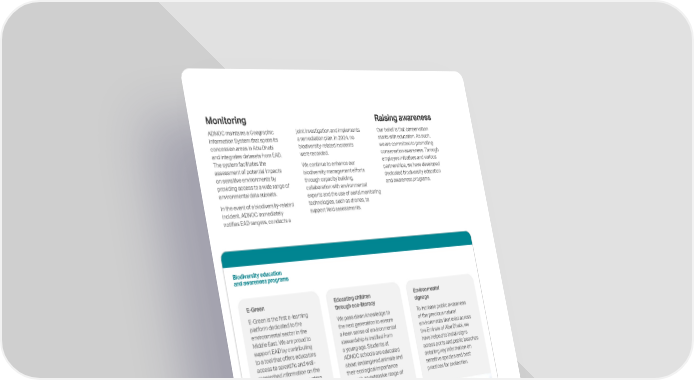 Monitoring Raising awareness ADNOC maintains a Geographic Information System that spans its concession areas in Abu Dhabi and integrates datasets from EAD. The system facilitates the assessment of potential impacts on sensitive environments by providing access to a wide range of environmental data subsets. In the event of a biodiversity-related incident, ADNOC immediately notifies EAD rangers, conducts a Our belief is that conservation starts with education. As such, we are committed to promoting conservation awareness. Through employee initiatives and various partnerships, we have developed dedicated biodiversity education and awareness programs. joint investigation and implements a remediation plan. In 2024, no biodiversity-related incidents were recorded. We continue to enhance our biodiversity management efforts through capacity building, collaboration with environmental experts and the use of aerial monitoring technologies, such as drones, to support field assessments. Biodiversity education and awareness programs E-Green E-Green is the first e-learning platform dedicated to the environmental sector in the Middle East. We are proud to support EAD by contributing to a tool that offers educators access to scientific and well- researched information on the environment and conservation initiatives in Abu Dhabi. Educating children through eco-literacy We pass down knowledge to the next generation to ensure a keen sense of environmental stewardship is instilled from a young age. Students at ADNOC schools are educated about endangered animals and their ecological importance through an extensive range of environmental books. Environmental signage To increase public awareness of the precious natural environments that exist across the Emirate of Abu Dhabi, we have helped to install signs across ports and public beaches detailing key information on sensitive species and best practices for protection. 96