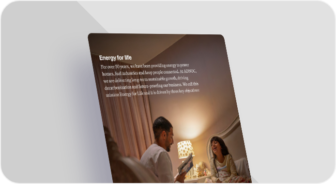 Energy for life Empowering Lives: We create opportunities for people, communities, and economies to thrive through the energy we produce and the investments we make in the UAE and internationally. Advancing Net Zero: We are decarbonizing todays energy and helping to build the energy system of the future. Powering Possible: We are embracing the power of Artificial Intelligence (AI) and advanced technology to drive transformational progress and enable the next era of global innovation and prosperity. For over 50 years, we have been providing energy to power homes, fuel industries and keep people connected. At ADNOC, we are delivering long-term sustainable growth, driving decarbonization and future-proofing our business. We call this mission Energy for Life and it is driven by three key objectives: 10