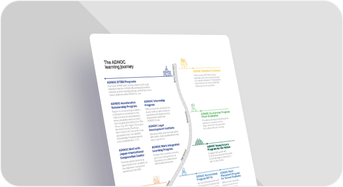 ADNOC Schools Offers a rigorous academic curriculum for elementary to high school students across four schools in Abu Dhabi and Al Dhafra. Schools Outreach Program Inspires young talents in STEM through nationwide initiatives, engaging students from grades 7 to 12. ADNOC STEM Programs Promotes STEM skills among students through initiatives like the ADNOC Bloomberg Education Initiative and Knowledge Bridge, and offers a free online platform called STEM for Life. ADNOC Accelerated Scholarship Program Supports outstanding students in disciplines essential for the UAEs economic development, where students study at more than 80 global institutions in The Times Top 100 Higher Education World University Rankings. More than 6,000 students have graduated from the ADNOC Scholarship Program since it was established in 1974. ADNOC Internship Program Offers university students the opportunity to gain hands-on experience through learning placements within the ADNOC Group. ADNOC Legal Development Institute Develops UAE national legal talent with world-class qualifications and work experience. ADNOC MoU with Japan International Cooperation Center Provides global internship opportunities for students at top Japanese companies operating in the UAE. ADNOC Yas in Schools Program Engages students in project-based STEM learning by designing and building model racing cars to compete in national finals. ADNOC Accelerated Program ROYA Nurtures Emirati talents with a Professional Development Program in partnership with Khalifa University, introducing them to the energy sector and developing their leadership and business skills. ADNOC Young Coders Program for the Nation Engages UAE youth with foundational programming skills and AI through a collaboration with 42 Abu Dhabi. ADNOC Technical Academy Trains young UAE Nationals as operators and technicians through a 30-month program. The Academy has trained more than 6,500 UAE Nationals since inception. ADNOC Work Placement Program for School Students Offers school students hands-on experience through placements within the ADNOC Group. ADNOC Work Integrated Learning Program Bridges the academic-industry gap by providing hands-on experience in collaboration with Khalifa University. ADNOC Accelerator Program Fresh Graduates Provides a development pathway to permanent employment for high-caliber Emirati graduates through on-the-job training. E l e m e n t a r y M i d d l e S c h o o l H i g h S c h o o l U n i v e r s i t y E n t r y l e v e l t a l e n t The ADNOC learning journey Through our growth and learning pillar initiatives: Over 17,000 students trained through STEM-focused outreach work placement programs in 2024 Over 3,000 interns placed within ADNOC in the last five years, gaining valuable experience that aids in launching their careers ADNOC received the prestigious CSR Contribution of the Year 2024 award at the Third Sector Awards, hosted by the Department of Community Development at the Abu Dhabi Energy Centre. The recognition highlights our impactful CSR initiatives and our contributions to advancing education across the UAE. 120