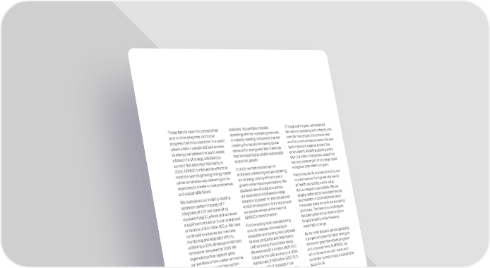 These trends have the potential not only to drive progress, but to put progress itself into overdrive. In a world where a billion people still lack access to energy, we believe the world needs a broad mix of energy solutions to convert that potential into reality. In 2024, ADNOC continued its efforts to meet the worlds growing energy needs whilst simultaneously delivering on its objectives to create a more prosperous and sustainable future. We maintained our industry-leading upstream carbon intensity of 7 kilograms of CO 2 per barrel of oil equivalent (kgCO 2 e/boe) and achieved a significant reduction in our operational emissions of 6.6 million tCO 2 e. We have continued to advance our methane monitoring and reduction efforts, achieving a 22% decrease in methane emissions compared to 2023. We expanded carbon capture, grew our portfolio of low-carbon ammonia, continued to invest in low-carbon hydrogen and grew our renewables energy capacity to 51GW through our shareholding in Masdar. We also launched XRG, a transformative international energy investment company, focused on natural gas, chemicals and scalable energy solutions. Its portfolio includes operating and non-operating interests in industry-leading companies that are meeting the rapidly increasing global demand for energy and the chemicals that are essential to enable sustainable economic growth. In 2024, we fast-tracked our AI ambitions, enhancing and accelerating our strategy, driving efficiency and growth while reducing emissions. We deployed new AI solutions across our business and delivered energy solutions to power AI. We trained over 40,000 employees in AI to help ensure our people remain at the heart of ADNOCs transformation. From enabling local manufacturing and job creation, to investing in education and training, we continued to drive prosperity and help build a UAE economy that is future ready. We returned $14.9 billion (AED 55.0 billion) to the UAE economy in 2024. Additionally, $19.6 billion (AED 72.3 billion) worth of products in our procurement pipeline were locally manufactured. To empower people, we created 7,000 new jobs for UAE Nationals in the private sector, bringing the total number of jobs created to 18,500 since 2018. Throughout the year, we remained focused on operating with integrity and care: for our people, the environment and the communities we serve. We also took important steps to protect the environment, including planting more than 2.8 million mangroves across the last two years as part of our large-scale mangrove restoration program. Everything we do is underpinned by our commitment to the highest standards of health and safety, a core value that is integral to our culture. We are deeply saddened to have experienced two fatalities in 2024 and have taken immediate steps to reinforce our safety protocols. The loss of our colleagues has strengthened our determination to uphold safety while fostering meaningful change. As we move forward, we are guided by a simple but powerful belief: energy is a force for good that drives progress and improves lives. At ADNOC, we will continue to act with clarity and conviction to help shape a sustainable future for all.