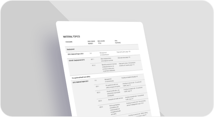 STANDARD DISCLOSURE NUMBER DISCLOSURE TITLE 2024 RESPONSE Employment GRI 3: Material Topics 2021 3-3 Management of material topics Empowering lives, page. 103 GRI 401: Employment 2016 401-1 New employee hires and employee turnover ESG data index, page. 149 401-2 Benefits provided to full-time employees that are not provided to temporary or part-time employees Empowering Lives - Compensation benefits and rewards, page. 110 Occupational health and safety GRI 3: Material Topics 2021 3-3 Management of material topics Keeping our people safe, page. 42 403-1 Occupational health and safety management system Keeping our people safe - Occupational health, page. 42 403-2 Hazard identification, risk assessment, and incident investigation Keeping our people safe - Occupational health, page. 42 403-3 Occupational health services Keeping our people safe - Occupational health, page. 42 403-4 Worker participation, consultation, and communication on occupational health and safety Keeping our people safe - Personal safety and work management, page. 44-47 403-5 Worker training on occupational health and safety Keeping our people safe - Safety training and workforce engagement, page. 47 403-6 Promotion of worker health Keeping our people safe - Occupational health, page. 42 Empowering lives - Employee wellbeing, page. 42 403-7 Prevention and mitigation of occupational health and safety impacts directly linked by business relationships Keeping our people safe - Contractor HSE, page. 46 403-8 Workers covered by an occupational health and safety management system Keeping our people safe - Occupational health, page. 42 403-9 Work-related injuries Keeping our people safe - Performance, Page. 48-49 ESG data index, Page. 144 403-10 Work-related ill health Keeping our people safe - Performance, page. 48-49 ESG data index, page. 144 MATERIAL TOPICS 158