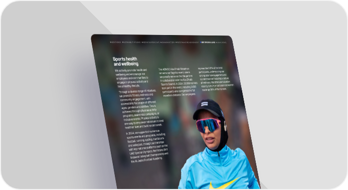 Sports health and wellbeing We actively promote health and wellbeing and encourage our employees and communities to engage in physical activity and live a healthy lifestyle. Through a diverse range of initiatives, we promote fitness, wellness and community engagement, with accessibility for people of different ages, genders and abilities. This is achieved through physical activity programs, awareness campaigns, or inclusive events. Physical activity is one way to empower individuals to lead healthier lives and build social bonds. In 2024, we supported numerous sports events and programs, including football, running, cycling, martial arts and volleyball, through partnerships with key national platforms such as the UAE Special Olympics, the Fatima Bint Mubarak Volleyball Championship and the Al Jazira Football Academy. The ADNOC Abu Dhabi Marathon remains our flagship event, where we proudly serve as the title partner in collaboration with the Abu Dhabi Sports Council. In 2024, 33,000 runners took part in the event, including 3,000 participants who completed the full marathon distance. Our employees represented 22% of the total participants, underscoring our strong internal engagement and commitment to fostering a culture of wellness. Marathon participation rose by 20% from last year and women made up 36% of the runners. EMPOWERING LIVES 121 ADNOC Sustainability Report 2024 KEEPING OUR PEOPLE SAFE ADVANCING NET ZERO HOW WE OPERATE SUSTAINABILITY AT ADNOC ABOUT ADNOC PROTECTING NATURE AND BIODIVERSITY